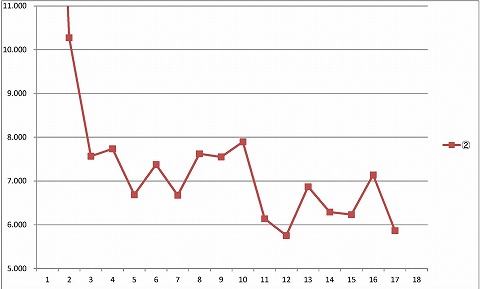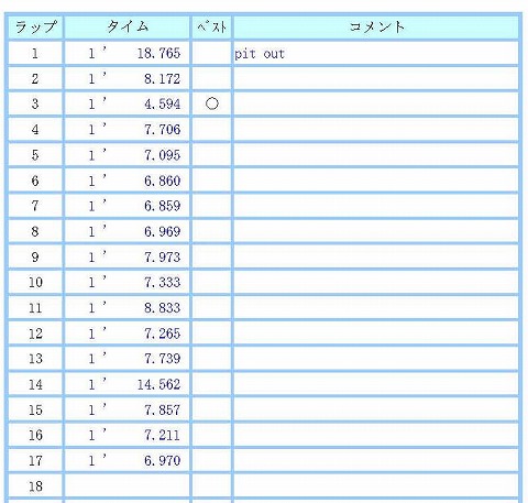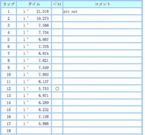 10:11 走行後のタイヤ 走行後のリヤタイヤ。 まあ、こんなもんでしょう。 4秒台が出たかもしれないけど、マグレの1発。 基本7秒台ですからね。 平均のラップから3秒も違うのなんて、あり得ない。 ラップタイムのグラフを見ていると、やっぱり計測ミスっぽいね。 (ーー;) |