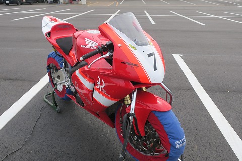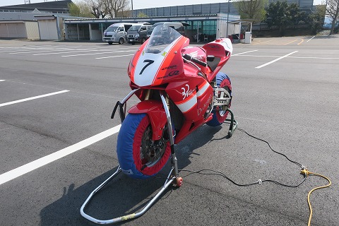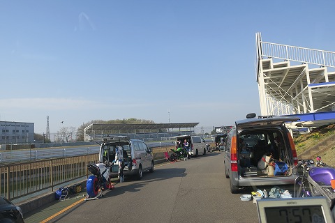 8:28 タイヤウォーマー タイヤの状態を確認したら、ウォーマー巻いちゃいます。 今日の走行1本目が9時40分からなので、1時間ちょっと前。 まあ、今日あたりは暖かいので、1時間前ですが大丈夫でしょう。 駐車場は広々!(笑) |