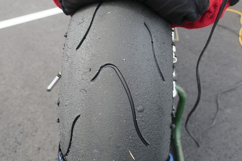 11:53 走行後のリヤタイヤ 2本目の走行が終わって、ハイエースのところに戻ってきました。 走行後のリヤタイヤ。 相変わらず、きれい。 開け方が足りないですね。 今シーズンの乗り始め、4秒はマグレだとしても、5秒台スタートです。 昨シーズンの終わりが5秒台までタイムを戻して、終わっているので、それを考えると、好調なスタートなんでしょうね。 今シーズンは、自己ベストの4秒台までは持っていきたいところです。 |