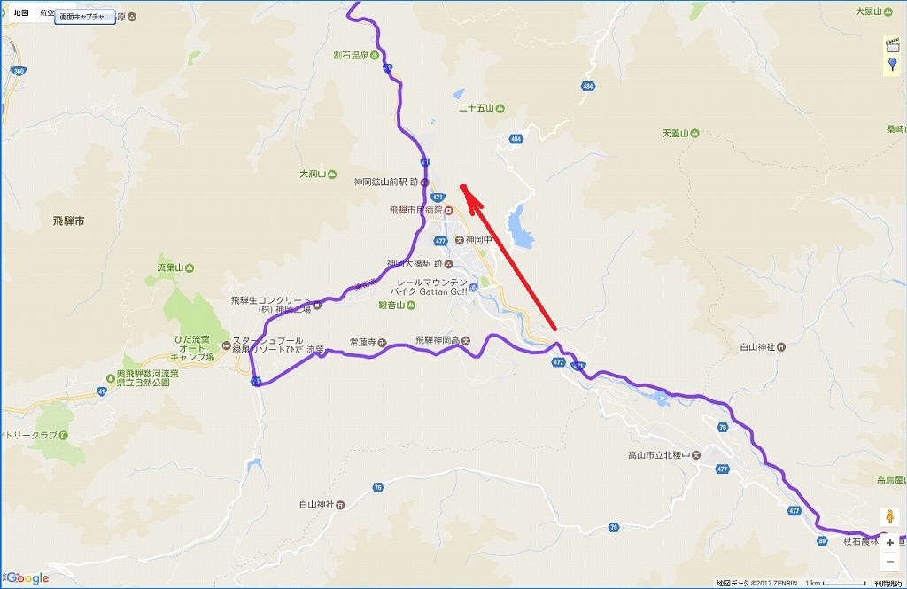 | でもね。 神岡農免道路のルートを自宅に戻ってから、GPSのロガーで見たら、国道471号線をそのまま直進するよりかなりの遠回りだったね。 たぶん真っ直ぐ行ったときの3倍くらい。 まあ、後で検証するから遠回りした感があるけど、知らなければ楽しい道を走った記憶だけが残るだけだけどね。 |