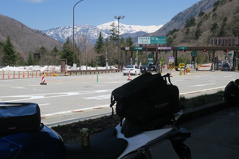 10:46 平湯料金所 安房トンネルを抜け、岐阜県側にある平湯の料金所を通過しました。 料金所脇にある駐車スペースにバイクを駐めて、ちょっと休憩。 料金所の向こうに雪化粧して見えるのは穂高岳かな。 さっき休憩した松本空港脇からここまで距離にして50kmほどしかないんだけど、やっぱ流れが悪くて1時間半くらいかかっちゃてるね。 |