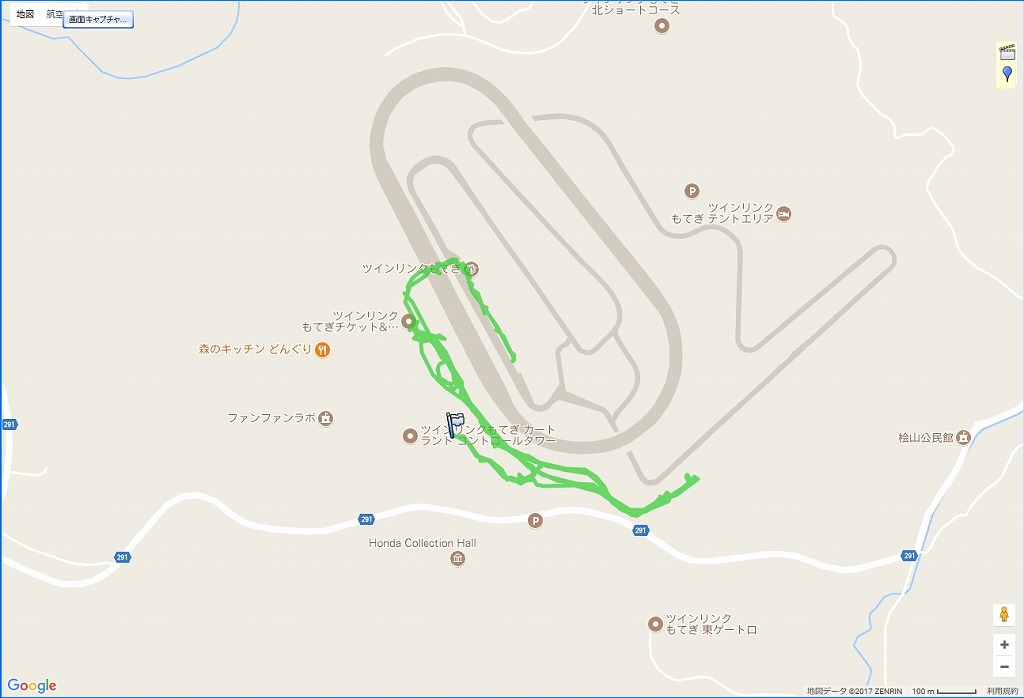| 歩いたね。(笑) GPSロガーを持って歩いていたのでログを拾ったら、メインスタンドとダウンヒルストレートとの間を3回も往復したんだね。 歩いた距離は合計で 8.1km でした。 落差も結構あるので、イイ運動になりました。 |