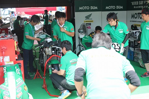 13:11 MOTO BUM ピットへ ピットウォークが始まり、MOTO BUMさんのピットへ。 清水メカにご挨拶。 MOTO BUM さんは今年も台数が多いみたいで、忙しそう。 『お邪魔しましたぁ〜。』 |