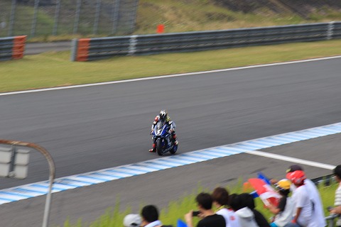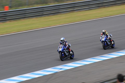14:27 JSB1000 またまたダンヒルストレート脇の観客席まで戻ってきました。 メインイベントになるJSB1000のサイティングラップが始まりました。 まず、やってきたのはYAMAHA FACTORYの二人。 まずは#5の野左根選手、続いて昨シーズンのチャンピオン#1の中須賀選手。 中須賀選手は昨日の予選、一人1分48秒台を叩き出しポールポジションです。 2番手は#5の野左根選手でした。 |