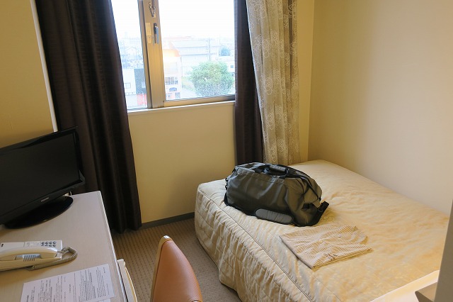 17:18 室内 チェックインをして、部屋に入りました。 お決まりの写真を一枚。 部屋はシングルで、ほぼ標準的なサイズ。 最近のビジネスホテルより若干余裕がある設計かな。 ここのホテルは大浴場はありません。 部屋はユニット・バスで、これも最近のピッタリ設計のビジネスホテルより余裕がある造りです。 宿泊先を三沢にしたので、地の利があるからです。 4年前の夏に仕事で訪れて、1ヶ月半ほど逗留したもんでね。 |