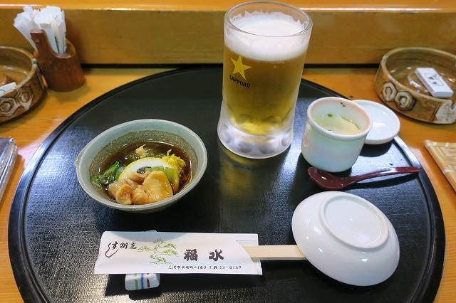 19:01 店内に入ると 店内に入り、8席ほどあるカウンタに案内されました。 お盆の時期と言うこともあってか、お一人様は自分だけでした。(汗) カウンターに座って、まずお願いした飲物は定番の生ビール。 そして、突き出し。 突き出しは、ここのお店の定番の茶碗蒸し。 それに、ホヤ。 ホヤが突き出しに出てくるなんて、流石東北の地ですね。 それでは、「いただきましょう。」 |