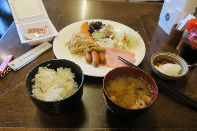 7:12 朝食 ホテルは朝食付きで予約。 朝食はブッフェです。 洋食よりも和食の方がメニューが充実していたので、ご飯をチョイス。 種類は結構充実してました。 お盆休みと言うこともあり、食堂は家族連れで混んでいましたね。 |