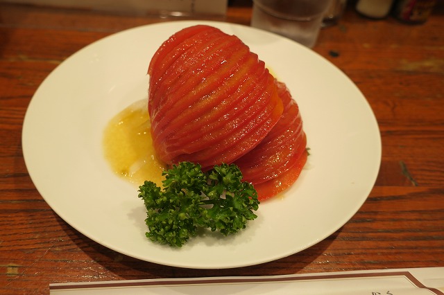 17:30 トマトサラダ 注文して、まず運ばれてきたのはトマト・サラダ。(¥800) 大きなトマトを3mmほどの厚さにスライスして、特製のドレッシングをかけたものです。 酸味の効いたドレッシングが美味しいです。 そして、何よりも薄切りしにくいトマトをここまで薄くスライスしていることに、ちょっと驚きます。 薄くスライスされたトマトは、美味しいです。 本音を言えば、ビールでも飲みたいところですが、クルマの運転があるから今日はダメなんですね。 |
