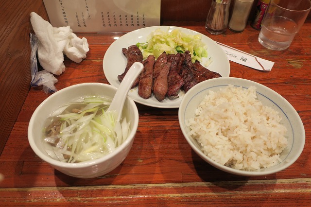 17:49 牛タン 焼き場を眺めながら、トマトサラダを突いていると、注文した”たん焼き定食”が運ばれてきました。 たん焼き定食は牛タンが5枚と6枚が選べます。 自分が頼んだのは、勿の論で、6枚。(¥1,850) (5枚だと、¥1,700なので、1枚150円か。なんて、下世話な話を挟んでみる。) それでは、早速「いただきます。」 厚めに切られた牛たんは、噛むと肉汁が”じゅわっ”と出てきて、旨々です。 (^_^)v やっぱり、ここの牛タンは間違いないですね。 硬めに炊かれた麦飯も、牛タンにピッタリ。 入っている麦の量は少なめですね。 テールスープは、塩加減が良くて、美味しい。 |