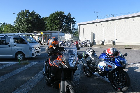 7:25 駒寄パーキング 谷原でガソリンを給油した後、練馬インターから関越自動車道に上がり、北西に走ること約100km、駒寄パーキング・エリアまでやってきました。 今日は天気が良くて、バイクが多いですね。 バイクのパーキングスペースが一杯だったので空いたスペースにバイクを駐輪。 |