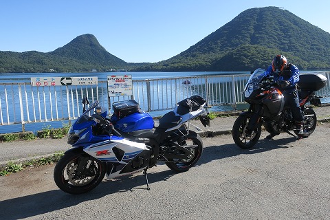 8:20 榛名湖 榛名山脇のストレートを通過すると、まもなく榛名湖畔に到着です。 写真を撮るためだけにちょっと停まります。 右手奥には榛名山。 写真にギリギリ収まっていて、榛名山は窮屈そうです。(笑) |