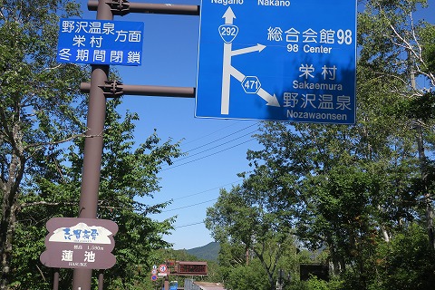 10:17 県道471号奥志賀公園線(おくしがこうえん せん)へ 横手山から国道292号線を志賀高原方面に下り、蓮池までやってきました。 ここから直進して中野方面には向かわず、右折して長野県道471号奥志賀公園線に入り、野沢温泉を目指します。 |