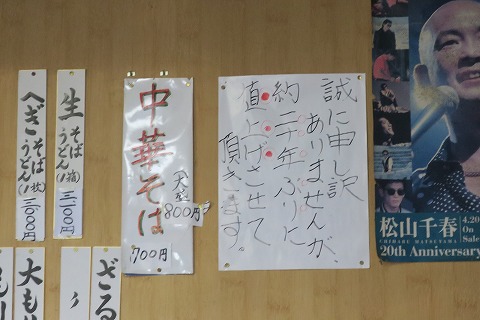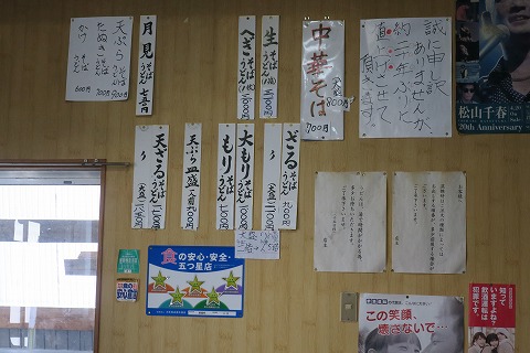 13:25 注文は 壁にあるお品書きは、極めてシンプル。 基本、そば・うどんだね。 でも、そば屋にもかかわらず、一番大きく書かれているのは”中華そば”かい。(笑) 注文は、へぎそばを食べたいところだけど・・・。 へぎそばは一枚、¥3,000! (゚o゚;) 1枚に3人前くらい入っているそう。 小さいのが無いのか聞いてみたら、「もりそばは同じそばを使っています。」とのこと。 でも、それじゃダメなのよ。 ”へぎ”に入ってなきゃ。 へぎを食べるわけじゃないんだけどさ。 せっかく25年ぶり以上にここまで来たんだから、やっぱへぎそばを食べないと。 と言うことで、MAOH さんを巻き添えにして、二人で1枚頼むことにしました。 (ありがとう、MAOHさん)(笑) 約20年ぶりに値上げしたんだ。 出来れば20年前の値段で食べたかったね。 (笑) |