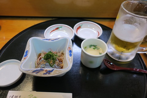 19:32 いの一番に 入店していの一番に注文したのは、生ビール。 ハーフで! んなことないか。 いつものパターンで写真を撮る前に飲んじゃいましたよ。 (笑) 突き出しは、いつものチビ茶碗蒸し、とアジのポン酢だった。 かな。 |