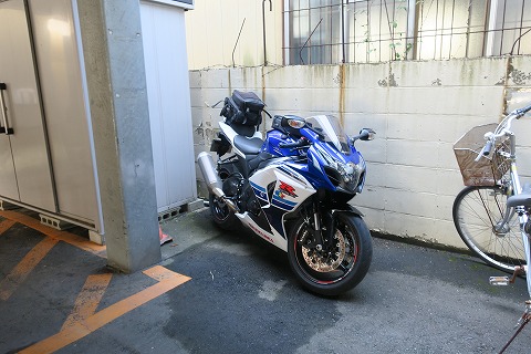 8:17 出発します。 朝食を食べた後、部屋に戻り出発の準備。 準備が出来たところで、下りてきてチェックアウトをして、バイクを駐めた駐車場の片隅へ。 それでは、荷物を積んで津出発の準備をします。 |