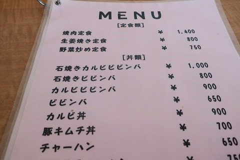 12:34 注文は 店内に入ると、テーブル上にコンロはなし。 焼き肉屋さんではないみたいです。 わずかな期待は、途切れました。 (-_-;) MENUを見ると、ビビンバなどの韓国系のどんぶりが並びます。 メニューの裏はラーメン類。 「羊は無いのかぁ~。残念」 でも、口の中は焼いた肉(ジンギスカン)のイメージで一杯。(笑) 致し方なく、ここは一番近いであろう”焼肉定食”(¥1,400)を注文。 |