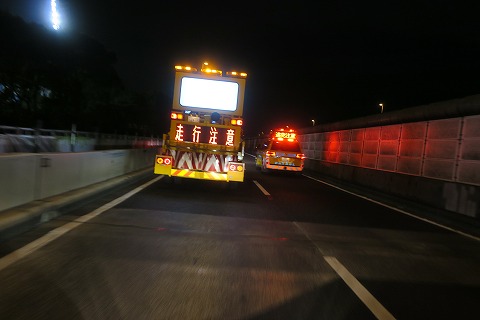 20:58 通せんぼ 浦和の料金所からは、首都高速に入り、都心環状線を経由して、1号横羽線へ入りました。 横羽線を快適に走っていたら、生麦を過ぎたところで、工事車両がいきなり通せんぼ。 首都高速神奈川7号横浜北線が今度開通するんだけど、その工事をするために、一時的な通行止め。 前のクルマが時間を作るために、時速5キロぐらいで先導してます。 バイクで後ろに着いて走るには、ちとペース遅すぎです。(ーー;) |