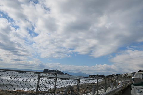 11:42 七里ヶ浜から ペースカーとは鎌倉の由比ヶ浜の交差点でさようなら。 国道134号線は、稲村ヶ崎を過ぎ七里ヶ浜に沿って西走します。 今日は雲が多くて富士山は見えませんが、晩秋になり湿度が下がってきたこともあり空気の透明度が上がり、江ノ島がくっきりと見ることができます。 七里ヶ浜沿いの国道134号線は、台風の波による浸食で道路を補修中。 なので、道幅が狭くて走りにくいです。 |