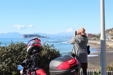 11:24 稲村ヶ崎に 長者ヶ崎で写真を写した後、国道134号線を北上北西に走り、鎌倉市に入り”稲村ヶ崎”までやってきました。 稲村ヶ崎は江ノ島のバックに富士山を望む景勝地です。 今日もカメラを持った人がたくさん集まっていました。 特に夕方には、たくさんの三脚が並びます。 で、写真を撮ろうと思ってカメラを構えていたら、目の前にオバサン登場! 流石だねぇ、その鈍感力。(爆) 気付いてないのかと思って、シャッター音をたててみたんだけど、ダメだね効き目なし。 なので、写真載せてあげます。(笑) その後、動画も写しているらしく、3分ほど目の前に突っ立てましたよ。 そして、居なくなったので写真を撮ろうとカメラを構えていたら、目の前を横切って歩いていっちゃいました。 凄いな、その度胸。 自分は持ち合わせていない。 |
