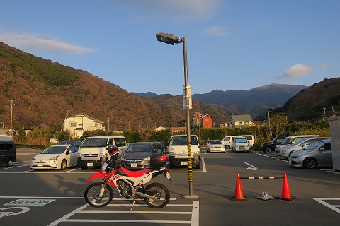16:25 土肥港(とい こう) 戸田の市街地からは、ふたたび県道17号線に戻り西伊豆の海岸線に沿って南下、今夜の宿を取った土肥の港までやってきました。 日没前に岸壁にバイクを置いて、写真を一枚。 今日は気温も暖かいこともあり、湿気も高め。 くっきりした太陽ではなくて、ぼやっとした太陽が水平線近くまで下りてきました。 |