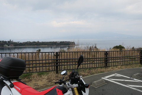 11:33 御浜岬(みはまみさき) 松崎で給油した後、国道136号線を取って返って土肥まで北上し、その後静岡県道17号沼津土肥線(ぬまづ とい せん)に入り北上を続け、戸田(へだ)の御浜岬が見えるところまで戻ってきました。 御浜岬は砂が堆積してできた”砂嘴(さし)”と呼ばれる珍しい地形らしいです。 晴れていれば、バックに富士山が見える景勝地ですが、残念ながら今日は見えませんね。 |