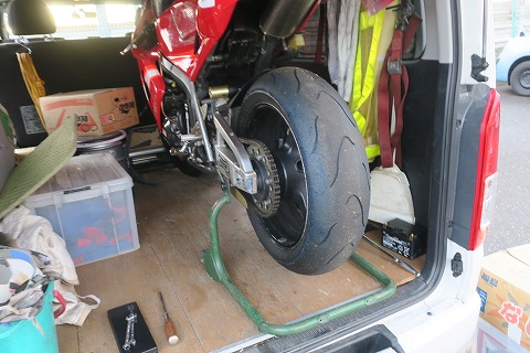 6:24 まずはチェーンを ハイエースを駐めたら、CBR600RRをハイエースから下ろす前に、まずはチェーン調整。 ハイエースに積むのに、ハイエースのリヤゲートに当たるので、CBRのリヤタイヤを前にずらして積んでいるんですよね。 そのためにまずは、リヤタイヤの位置を合わせて、チェーンの調整をします。 |
