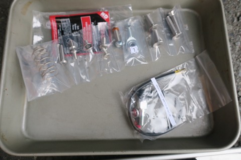 14:55 細かいパーツ そして、これはボルトとかの細かいパーツ。 右下は、リヤのストップランプの圧力スイッチ。 純正の機械式のスイッチは使わずに、圧力スイッチに変更する仕様になってます。 (凝ってますね。) |