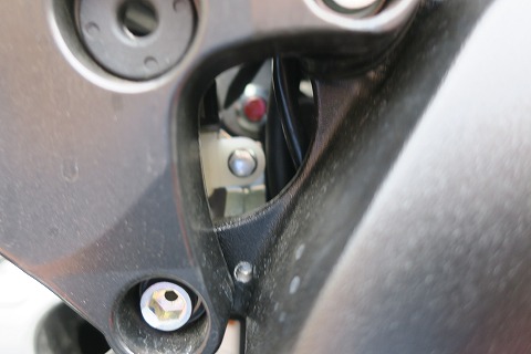 16:30 バック プレートは ノーマルを取り外しました。 裏のプレートはノーマルの部品を使います。 ノーマルでも、3ポジション変更出来るように 青色のねじロックが残っているのが、今まで着いていた場所。 |