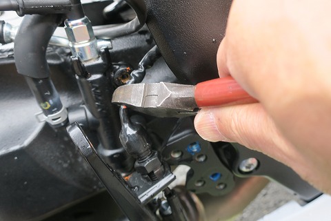 15:33 マスタ シリンダを外す 次ぎに、ノーマルのブレーキペダルから、ブレーキのマスタ シリンダを外します。 外した割ピンは、新しいバックステップでは使いません。 |