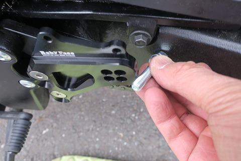 16:33 ボルトが で、ステップを取り付けようと、ボルトを裏から通そうと思ったら・・・・。 スイング アームが邪魔して、ボルトが入らなーい。 (-_-;) 右側は後からでも入ったのにぃ。 と言うことで、せっかく取り付けたプレートを一旦外して、ステップを先に組んでからら、もう一度プレートを取り付け。 (せっかく、ねじロック塗って付けたのにね。)(爆) |
