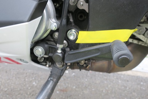 16:44 シフトアームの位置を ノーマルのシフト アーム。 シフトアームの位置がわかりやすい様にフレーム側に黄色テープを貼っておきます。 |