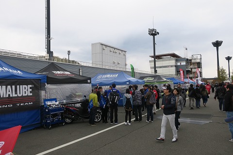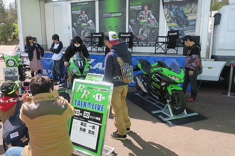 10:19 YAMAHAは レースのフラッグシップ、YZF-R1の展示はありませんね。 なぜ〜? レースを観にきたお客さんは、JSB1000のベースモデルに興味があるとおもうんだけど・・・。 |