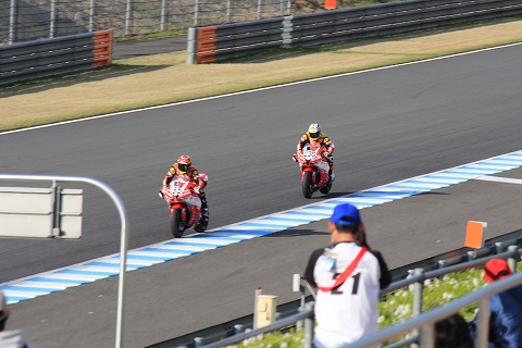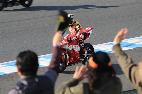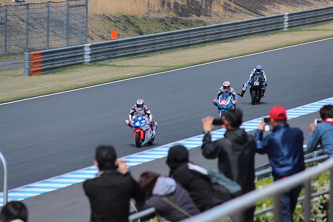15:14 優勝したのは JSBの決勝レースが終了しました。 優勝したのは、ポールからスタートした#21の中須賀選手。 中須賀選手は、昨日の決勝と合わせて、2戦連続のポール トゥ ウィンでした。 強い中須賀選手が戻ってきた感がありますね。 で、2位だった野左根選手とウィング ラップ。 写真を撮ろうとしたら、前のお客さんが・・・・ (-_-;) 残念でした。(笑) |