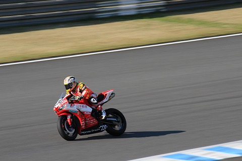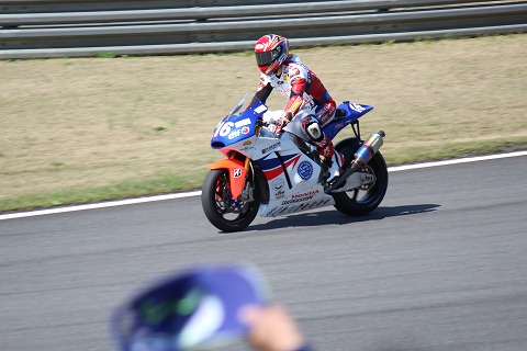 14:45 チャンピオンの 昨年のチャンピオン ゼッケンはもちろん#1の高橋巧選手。 HONDAもワークスのHRCで、久しぶりにトリコロールカラーの復活です。 ただ、今回のモテギは直前に転倒ケガをして、本調子ではないのが残念なところです。 |