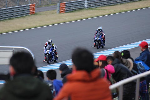 14:29 続いてJSB1000 J-GP2の続いて、メインレースとも言えるJSB1000の決勝レースが開始されます。 メインスタンドでは選手紹介が行われています。 今回、第1戦で開幕戦ですが、JSB1000クラスは2レース開催。 昨日の土曜日に行われた第1レースでは、#21の中須賀選手がポール トゥ ウィンで優勝しました。 今日の第2レースも、中須賀選手がポールからスタートになります。 |