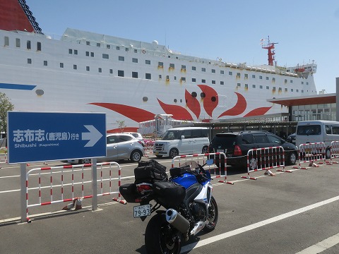 14:35 乗船手続き 弁当を食べる前に、まずは14時から始まっている乗船手続きを。 今日は混んでいる(満席)なので、バイクの乗船は早めて出港の1時間半前の15時30分からだそう。 まあ当然ですが、今回のフェリーは前売りで購入しましたが、今日4月29日発の行きの料金が¥13,600で、帰りの5月4日発の帰りの料金が¥24,120 でした。 4月29日は割引期間に該当して、5月4日は通常料金なんだそうです。 |