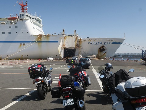 15:27 乗船が始まる 15時30分近くになって、バイクの乗船が始まろうとしています。 この大阪−志布志航路では、まずは業務で使用しているトラックの乗船が優先。 その後にバイクの乗船になります。 そして、最後にクルマ(4輪)の乗用車の乗船になります。 (つづく) |