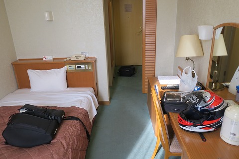 16:40 部屋に チェックインをすませ、部屋に入ります。 部屋はシングル・ルーム。 国民宿舎でシングルの部屋があるのは有り難いです。 最近のビジネスホテルの様にギチギチの設計じゃなくて、余裕があっていいですね。 ギチギチのビジホだとヘルメットを置くスペースも無い、椅子も十分に引くことができないところもあります。 |