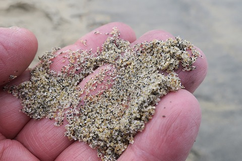 17:21 ちょっと粗めの 砂浜の砂を手に取ってみると、砂はちょっと粗め。 細かくないので、体に付いても、振り払えば落ちちゃいます。 |