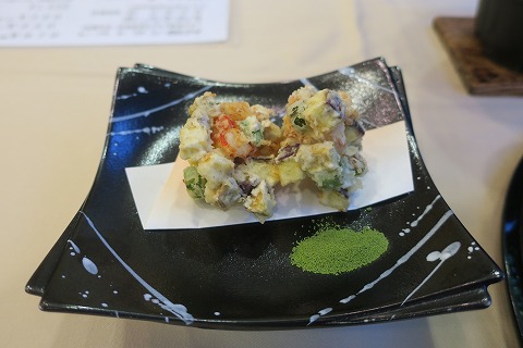 18:46 揚げ物は 揚げ物のエビとさつまいものかき揚げ。 抹茶塩でいただきます。 エビの味よりもサツマイモの甘さが勝ち。 でした。(笑) |