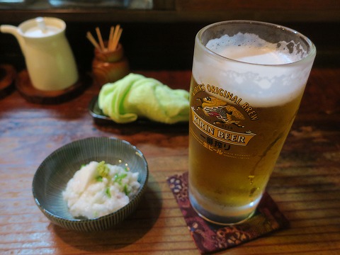 18:03 とりあえず まずは定番。 とりあえずビール。 店内は、L字型のカウンターで8席くらいかな。 2階は座敷になっているようです。 目の前にガラスのショーケースの中から何種類かのサカナが並んでいます。 まずは、その中から3種類ほど選んで注文。 |