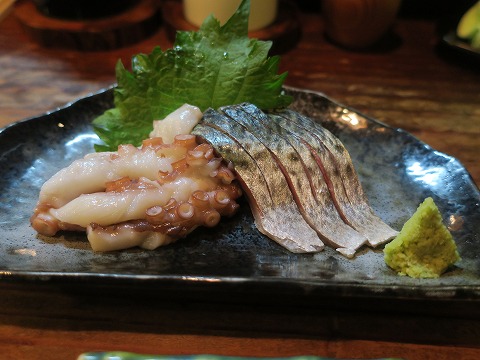 18:06 タコとサバ まず供されたのは、サバとタコ。 タコ、好きなんですよね。 タコは熱を入れたものではなく、生ダコ。 味はほんのりしかしないんだけども、歯ごたえが好きですね。 サバ、美味いです。 脂ののり具合も、冬場のしつこい程ではなく、イイ具合です。 |