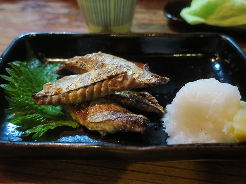 19:12 カツオの腹皮 大将はカウンターの中で忙しく料理を作っています。 ちょっと手が空いたスキに、黒板から注文。 のんびりと八幡を呑みながら、待っていると”カツオの腹皮”が出来上がりました。 ”カツオの腹皮”って聞いた事が無かったので、頼んでみました。 カツオの腹皮は、カツオの腹側の身の部分のことだそうで、鰹節を作るときは使わない部分だそうです。 日本一の鰹節の生産量を誇る鹿児島の枕崎市では、当然この腹皮の部分がたくさん余る訳で、昔からよく食べられていたそうです。 塩焼きにされたカツオの腹皮は、脂がのっていて香ばしくて旨い。 焼酎のあてにピッタリです。 当然、焼酎はお代わりしましたよ。(笑) |