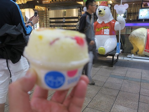 20:06 白熊を食す 天文館むじゃきは、地下1階から4階まで、鉄板焼きのお店から、カジュアルレストラン、そして薩摩の郷土料理を供するお店と、白熊だけじゃないんですね。 ゴールデンウイークの中日とは言え、観光客がたくさん、ウェイティング状態でした。 店内で食べるのはあきらめて、アーケードに置いてある椅子に腰掛け、お持ち帰り用のカップの”白熊”をいただきます。 カップの白熊は、カチカチで、お店で食べるフワフワの白熊とは違っていて、ちょっと残念。 でも、まあ、いいか。(笑) |