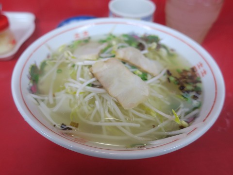 22:51 夜食にラーメン 頼んだのは、ラーメン普通サイズ、500円。 安いですね。 とんこつベースのラーメンの様ですが、透き通ったスープが美味しそうです。 塩ラーメンっぽいですが、醤油も効いています。 |