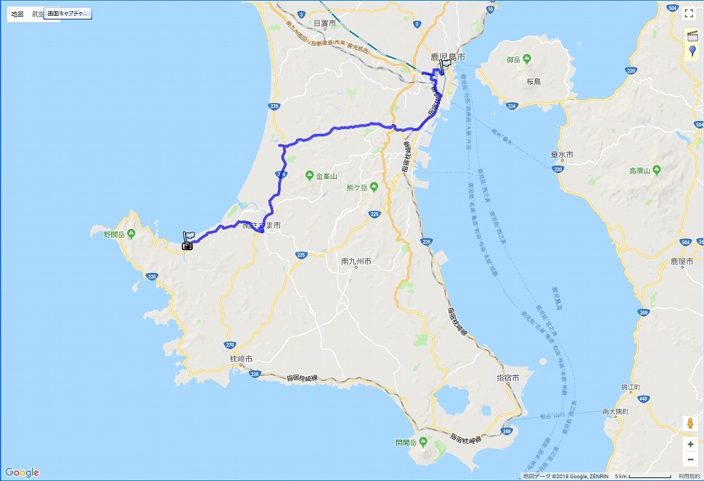 10:17 今日のルートは 走り初めの距離計は 8,439 km。 今日のツーリングのルートは、流石に真っ直ぐ指宿に向かうことはしませんが、北西端の長島までは (この雨の中では、時間的に無理です) まずは鹿児島市を出発し、西走して日置市方面に向かい、東シナ海に出る予定です。 東シナ海側に出たら、南下して鹿児島県の最西端になる薩摩野間岬を廻って、枕崎を通り、指宿に入りたいと思います。 |