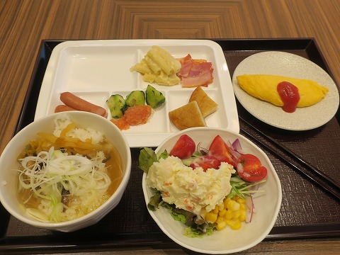 8:26 朝食は 朝食はブッフェ形式。 昨晩飲みすぎ食べ過ぎなので、軽めに、軽めに。 左下の料理は、鹿児島の郷土料理で”鶏飯”。 (正確には奄美地方の郷土料理らしい) 鶏のだし汁をかけたお茶漬けの様な食べ物。 飲み過ぎが翌朝には、胃に優しい。(笑) |