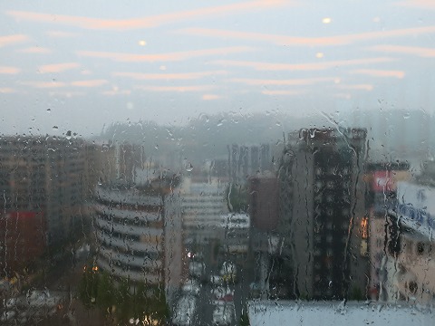 7:58 アンニュイな 朝、目を覚ましホテルの窓を眺めると、『汚れてるなぁ〜。』 じゃなくて、外を眺めると”雨”。 (+_+) 天気予報の大当たり! 今日の降水確率は 100%です。 しかも、しっかりと降るそうです。 (-_-;) 昨晩呑んだこともあり、ちょっとアンニュイな朝を迎えました。 昨晩の内に雨100%がわかっていたので、ちょっと夜更かし、遅めの朝となりました。 |