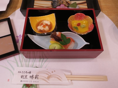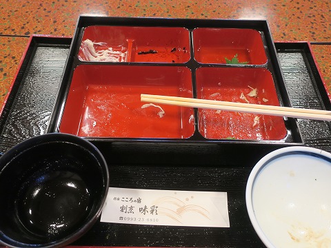 19:35 夕食です。 この宿の隣が、”指宿こころの湯”と言って日帰り温泉にもなっている施設です。 (温泉は砂蒸し温泉じゃなくて、普通の温泉ね) 初日に泊まった内之浦の国民宿舎と同じように、宿泊のお客さんは無料で利用できるシステムでした。 その温泉に行ったんだけど、露天風呂が暴風雨でとても入れたもんじゃありませんでしたね。(笑) 温泉に入った後は夕食です。 夕食は、2分制になっていて、自分は遅い方の7時半から。 (早い方は6時からだったかな。) 早いほうだと、夕食後にやることなくてね。(笑) 食事は、同じ建物の1階にある食事処で。 |