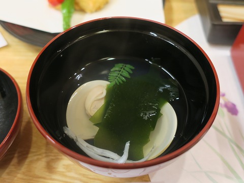 19:46 お椀 お椀は、ハマグリ。 ワカメに白魚、百合根に木の芽が添えられて、手が込んでます。 ハマグリは良い出汁がでてます。 料理の最初の方にお椀が出てくるなんて、本格的な会席料理ですね。 |